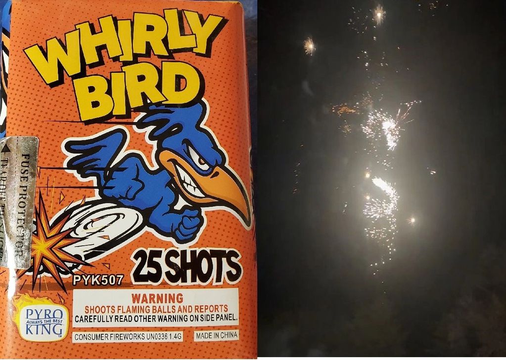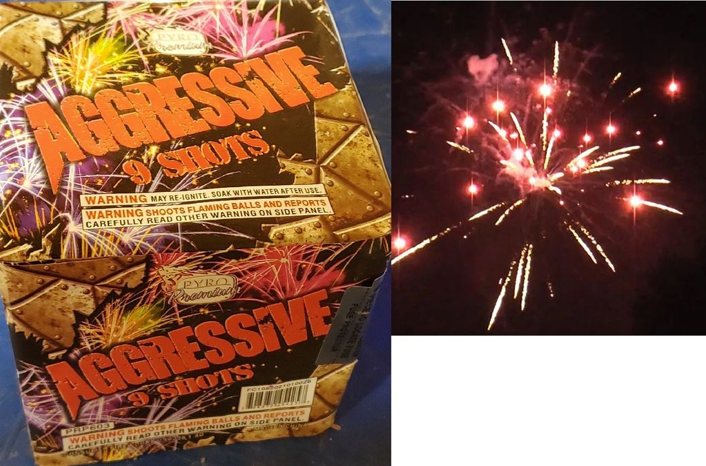 Red, silver and green comet tails; green to red, red to blue, purple to yellow; red and green bees; red, blue & green bouquet with loud whistles, red, silver and green comet tails with report; green to red, red to blue & purple to yellow with report.