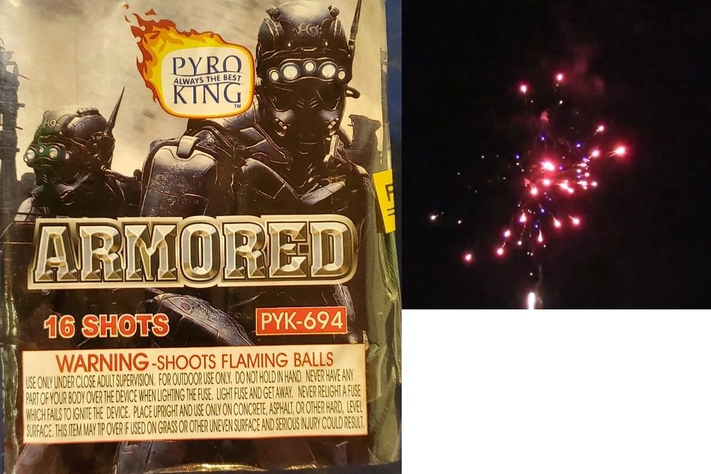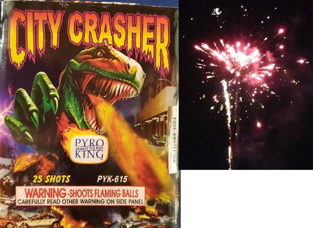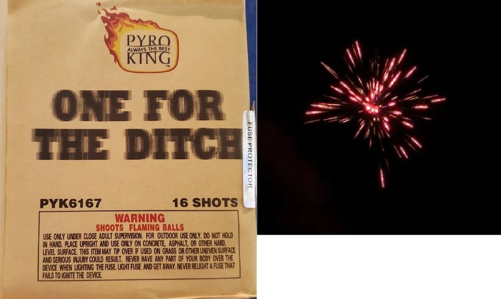 Whistling and swirling tails to crackling flowers alternating with rows of brocade tails to red stars with silver glitter, purple stars with green glitter, and blue stars with gold glitter. 30 shots