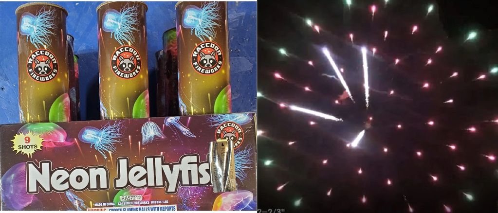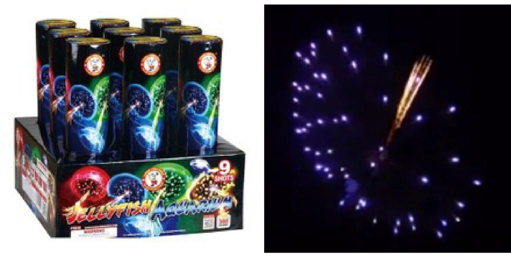 red or green tails spray to silver whirling flower. Silver whirling tail to color breaks with Jelly fish.