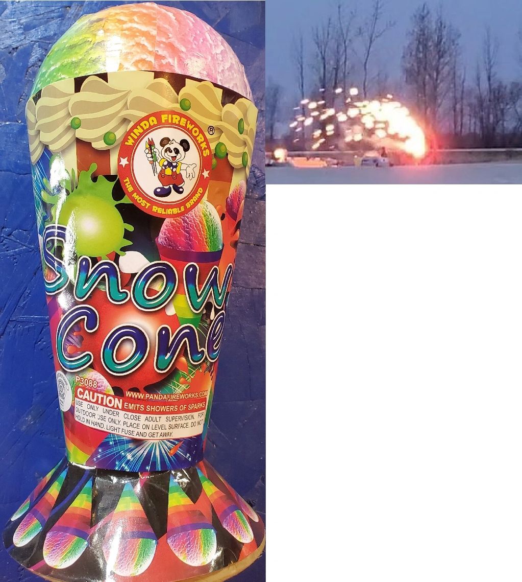 Multicolored fountain that screams and ends with colorful ground spinners.