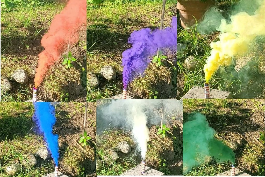 thick colored smoke that lasts a little over a minute. Choice of colors: Orange, blue, pink, purple, yellow, red.